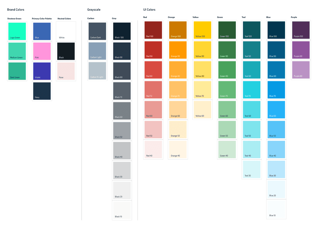 These I broke down into three categories, to make it more clear when and how each should be used. I designated our primary Green scale for primary actions such as buttons, and to indicate active state.