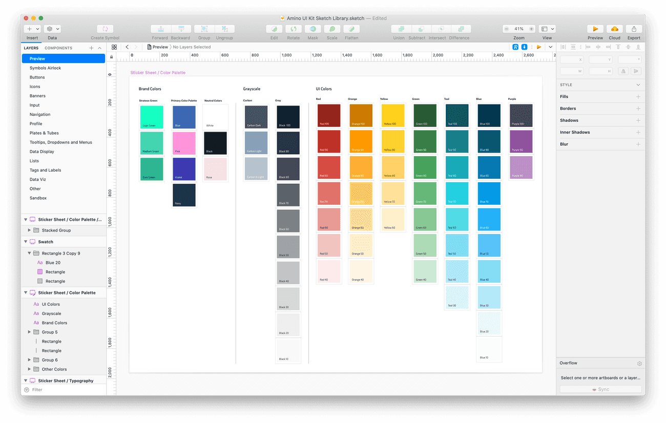 With our color scales fully defined, I produced a final Color Palette in Illustrator which I distributed via Adobe Creative Cloud so that the design team can centrally maintain the colors. Finally, and most critically, I added the full color palette to the Amino Sketch Library.