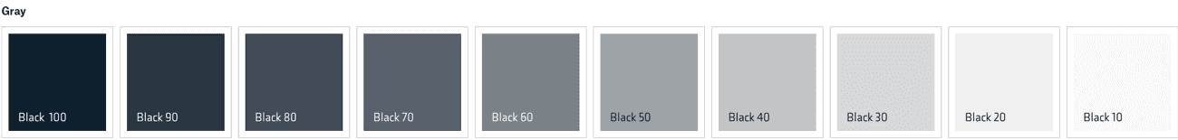 The next clear category of colors were grays. For the most part, the grays from my audit were all over the map. I arrived at two scales that met most of our needs: a "Carbon" tinted one that hued towards blue, and a strictly gray scale with ten steps ranging from nearly black to nearly white.