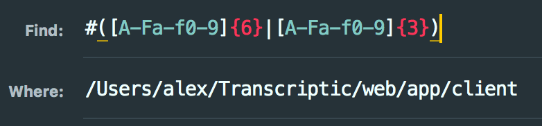 The first step was to document all the colors used across the Transcriptic products. This was a fairly simple task. With some simple regexes, I pulled out all RBG, HSL and HEX values in each repository.