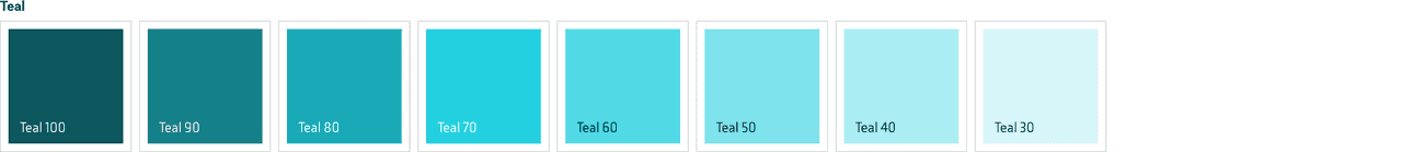 Second after blue was teal in terms of usage. It stood out as another neutral color that works well for labels and notifications that shouldn't convey status. Eight shades seemed to cover all reasonable uses for teal. I slanted the scale towards darker shades, as there were no documented uses of light teal.