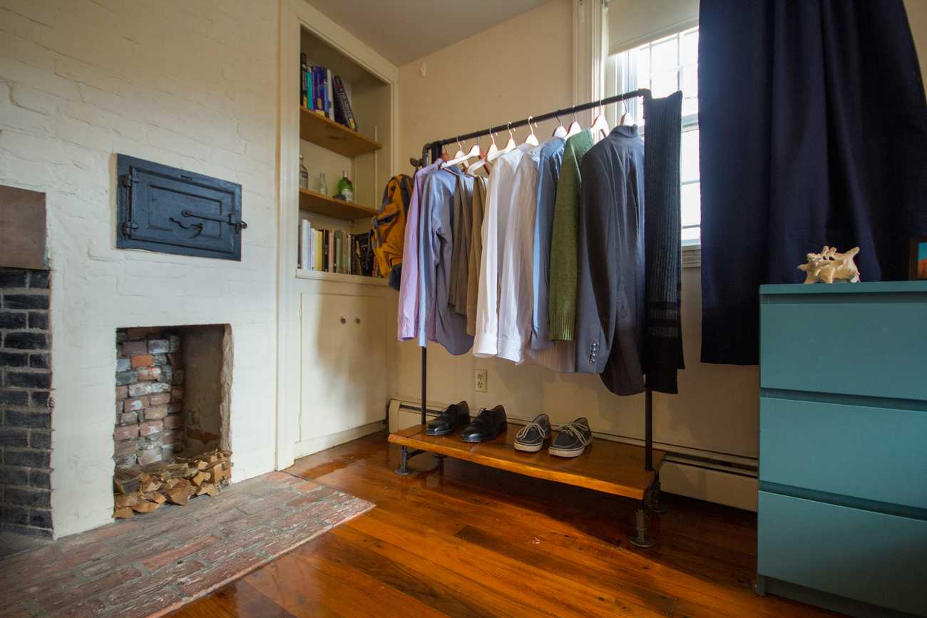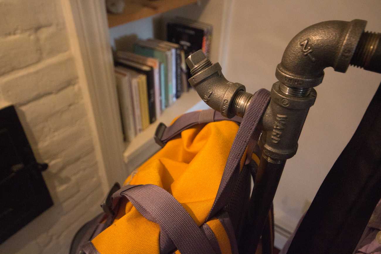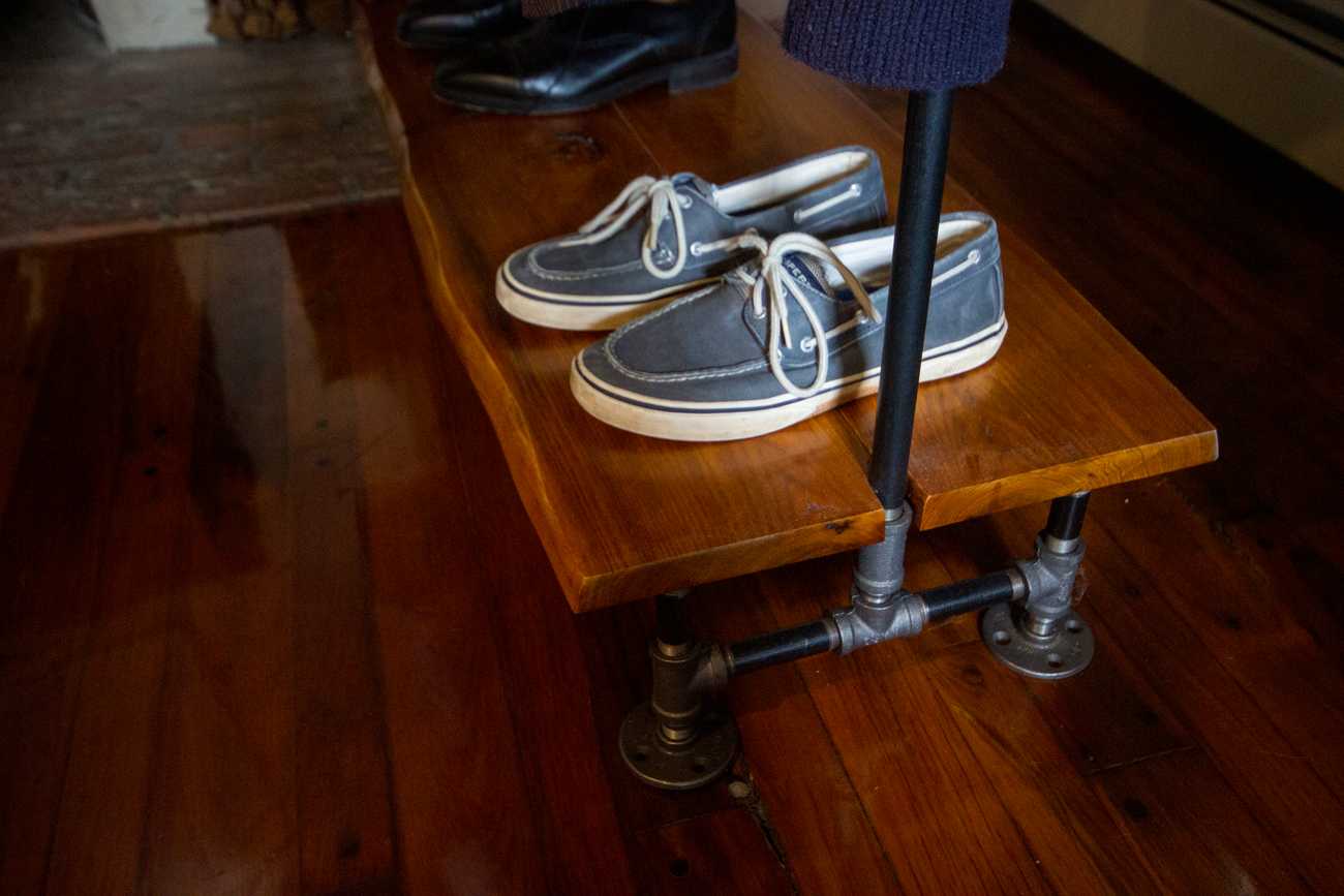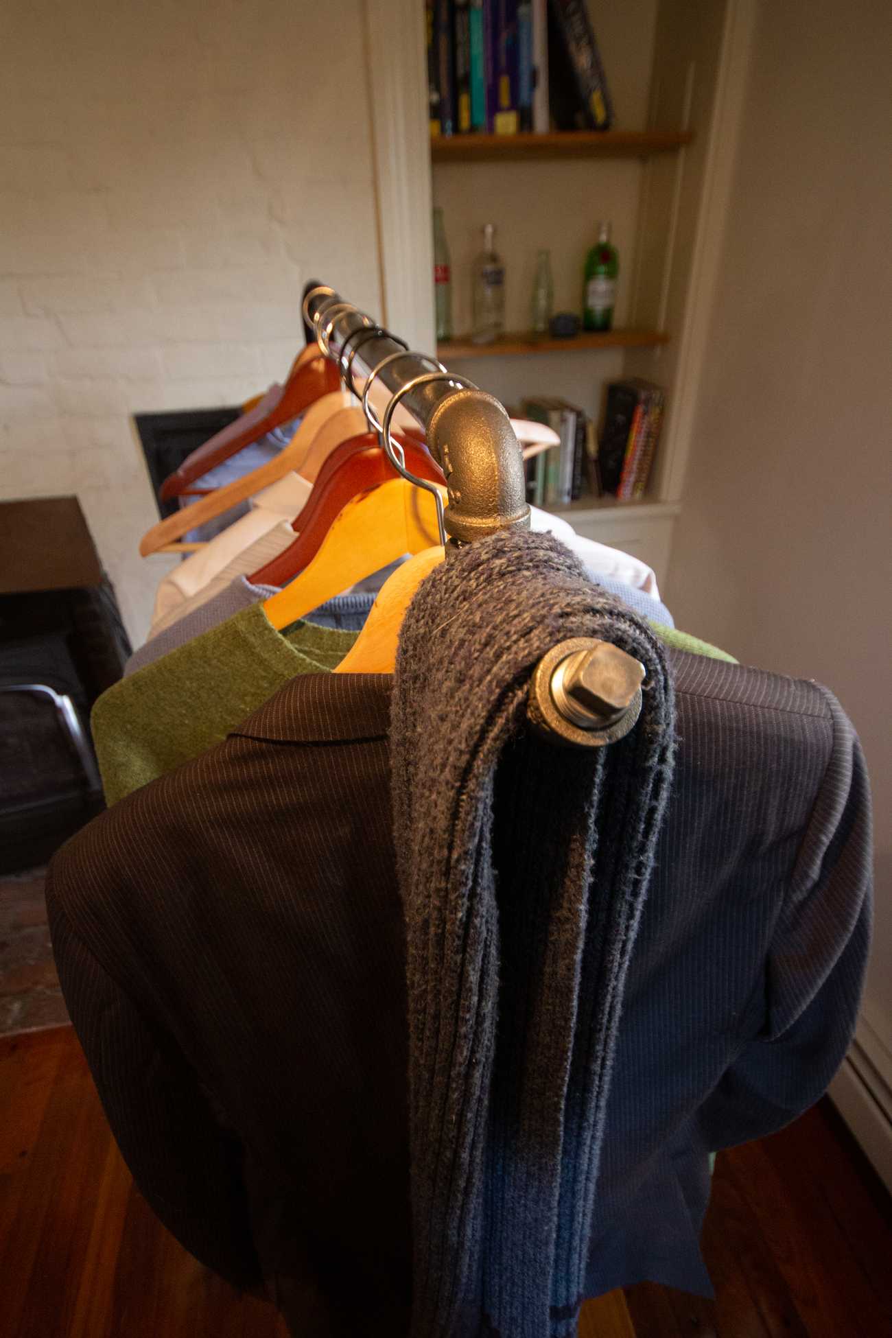 This simple coat rack is made from steel pipe and sports a bottom shelf of Butternut wood. It's perfect for bedroom setups where the coatrack will be on display.