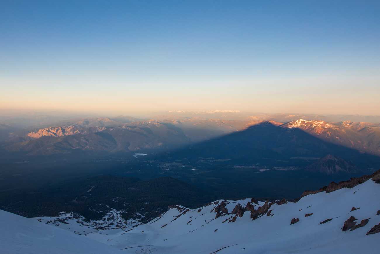 As I clung to the ice-encrusted face of Mount Shasta, I watched daylight slowly begin to sear the California landscape. I had been awake and climbing for hours, and yet I could see day just beginning all around me. But what made me stop, and dig my ice axe into the crust to steady myself against the wind, was the silhouette of Mount Shasta itself, in relief against the golden morning light and laid out across a canvas of lakes and roads and towns. And the sight was almost incomprehensible.