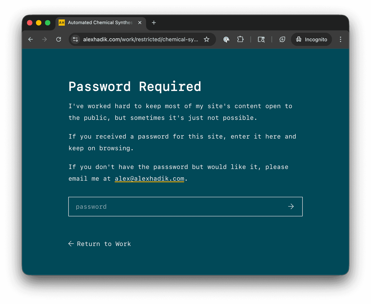 Before we get into code, here’s the shape of the problem I was trying to solve. I wanted to ensure some (but not all) of my posts couldn't be accessed, or indexed by Google, without a password. My requirements were:
